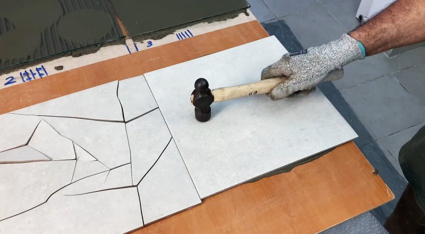 Когда плитка положена, нужно простучать молотком: сразу видно, что первые два варианта лопнули, поскольку в них были воздушные карманы, тогда как третья плитка целая.