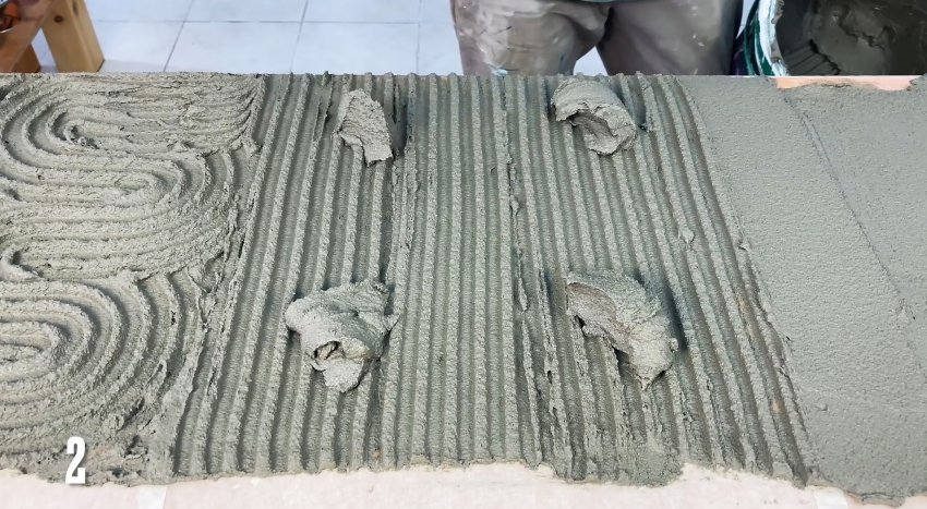 - 2 плитка – провести шпателем ровные линии, но добавить на углы плитки и в ее центр немного раствора;