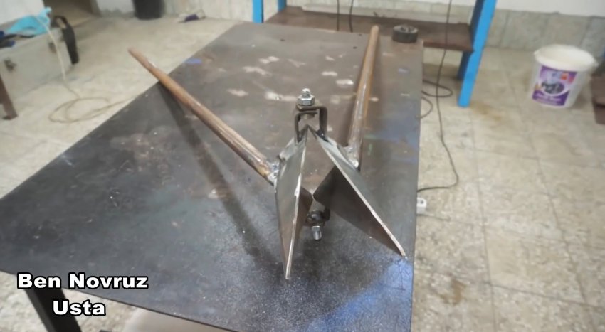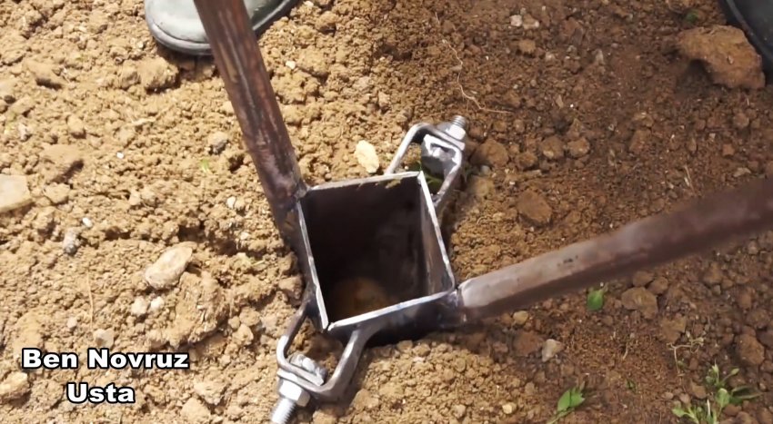В принципе наша самодельная картофелесажалка готова к применению по прямому назначению. Устанавливаем сомкнутое острие рабочего органа в нужное место. При этом ручки из труб должны быть разведены.