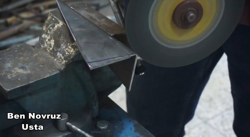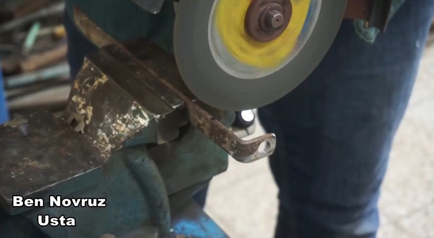 На краю стальной полосы сверлим по центру отверстие. Зажимаем конец полосы с отверстием в тиски, изгибаем ее на 90 градусов и полученную заготовку отрезаем от полосы на некотором расстоянии от линии изгиба.