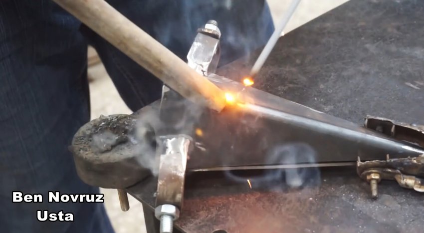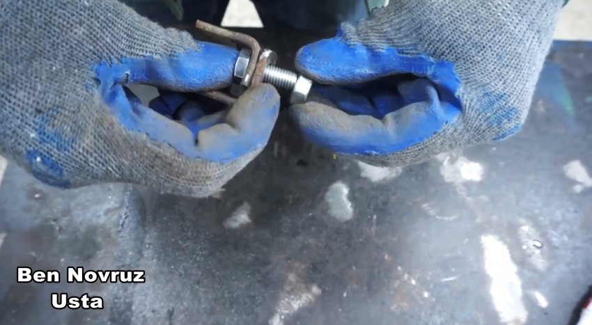 Заготовки, вырезанные из квадратных труб, прижимаем друг к другу концами сторон, зажимаем в тиски и привариваем к ним ножки П-образных узлов симметрично с двух сторон поближе к краю заготовок, которые должны при этом поворачиваться на болтах и расходиться в сторону.
