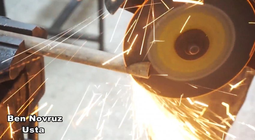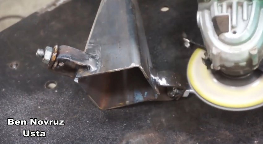Заостряем одну сторону пары труб соответствующей длины на клин и привариваем симметрично к углам клинообразных заготовок с двух сторон чуть ниже уровня П-образных узлов. Все сварочные швы зачищаем болгаркой.