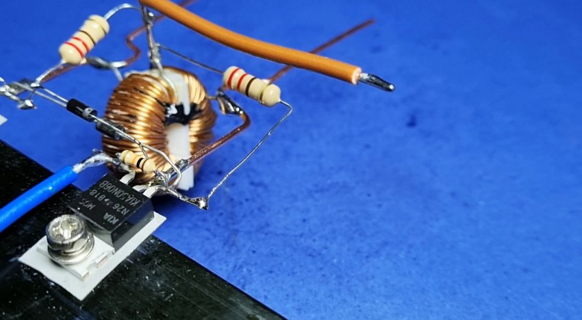 Второй резистор нужно тоже припаять к этой жиле, но его оставшийся конец подключить к первой ножке первого транзистора. Затем паем к проволоке конденсаторы с индукционной плиты.