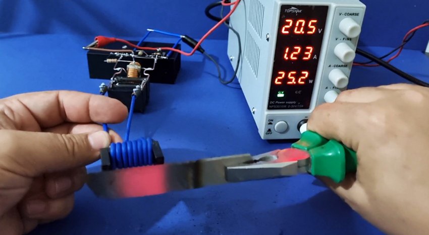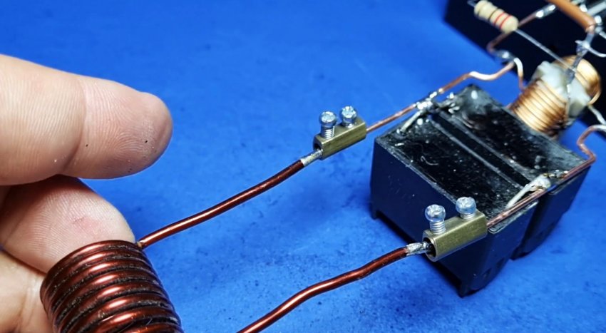 Теперь с помощью клемм, к проволоке за конденсаторами можно подключать катушку с эмалированной проволоки, в которой и будет нагреваться помещений металлический предмет. Питание установки осуществляется блоком на 12В. Его плюс подключаем к проводу на катушке индуктивности, а минус на перемычку, соединяющую транзисторы.