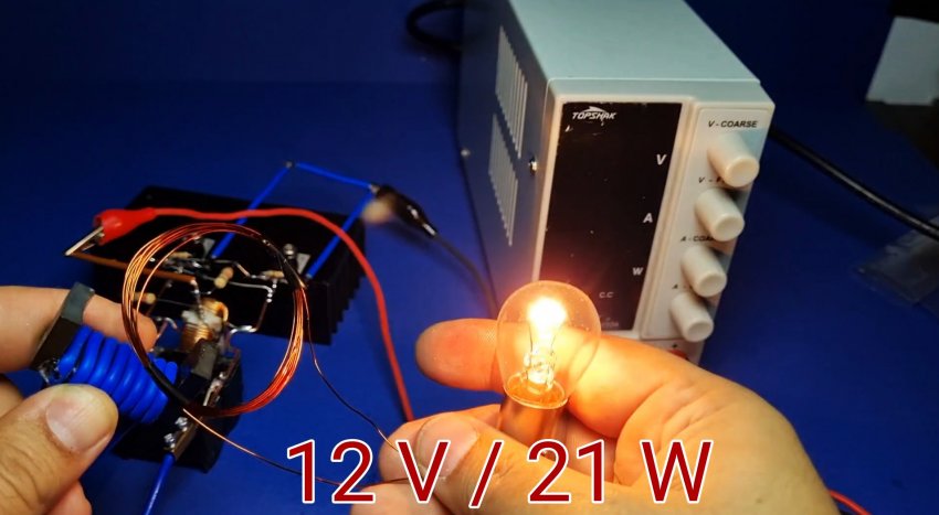 Такая катушка позволяет разжигать лампочку, греть тонкие лезвия, а также кипятить воду в металлической посуде. Область использования этой установки весьма обширна, особенно она нужна для закалки металла.