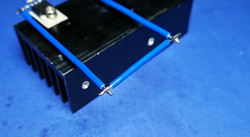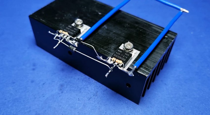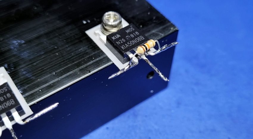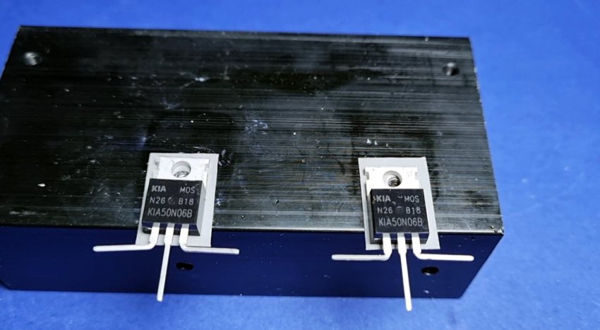 К алюминиевому радиатору, используемому как станина устройства, необходимо прикрутить два транзистора 50N06.