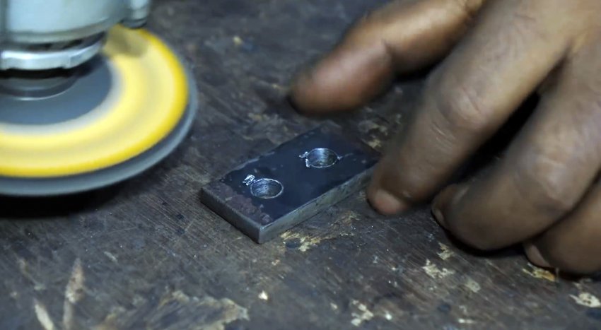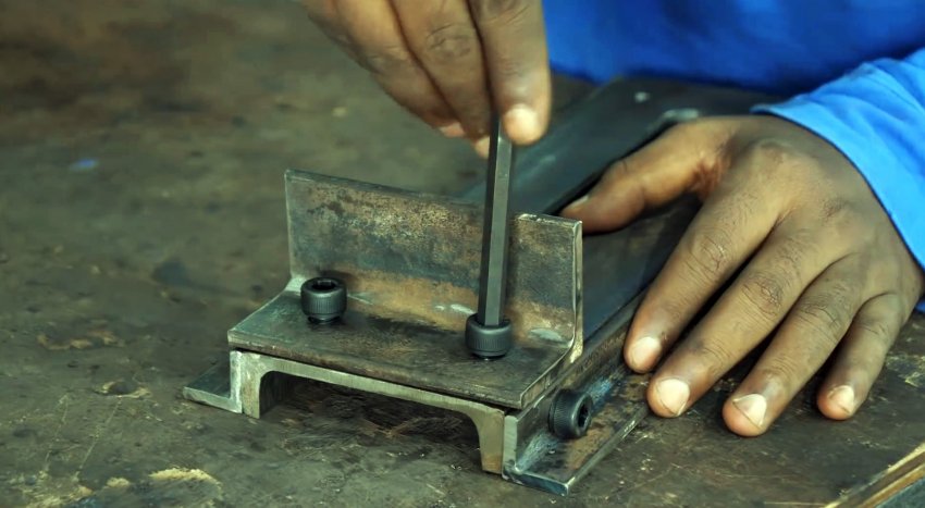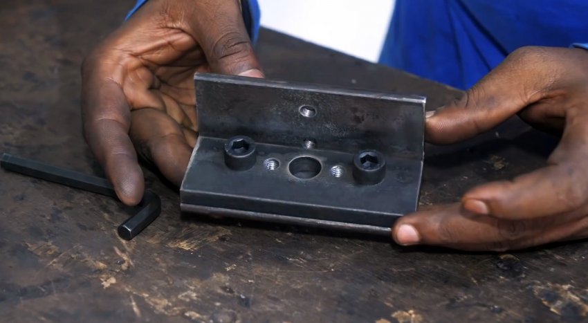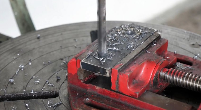 В полосе по разметке в продольном направлении сверлим пять отверстий: в центре – большое, по краям – средние и два малых, в которых нарезаем резьбу. Прикручиваем пластину к уголку болтами под шестигранник и удаляем выступающие из полки концы болтов.