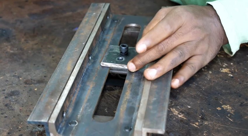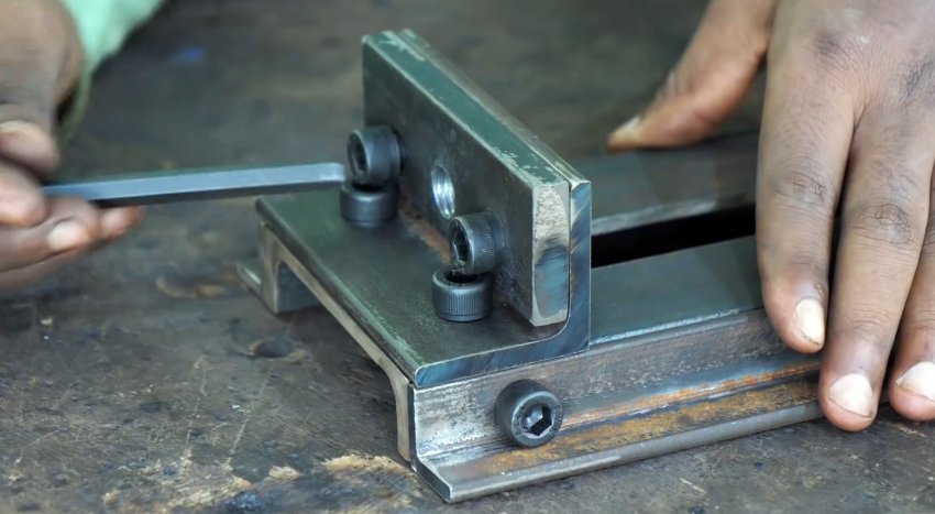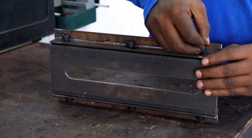 В прямоугольной и квадратной полосках металла сверлим по два одинаковых отверстия. Уголок с пластиной устанавливаем поперечно на стенку швеллера. Переворачиваем его, в прорезь укладываем прямоугольную пластину, сверху на прорезь – квадратную и закрепляем все двумя болтами под шестигранник.