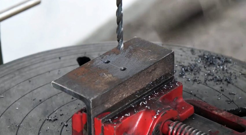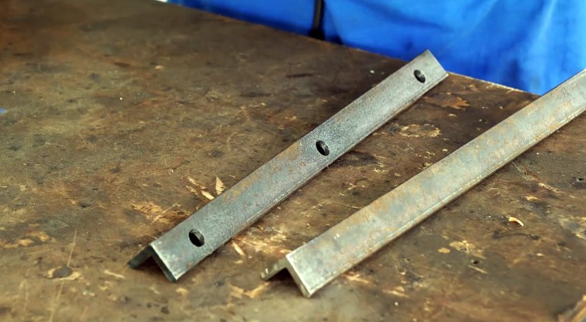 В двух заготовках из уголка, равных длине швеллера, в одной из полок сверлим три отверстия, как и в полках швеллера.