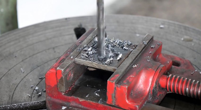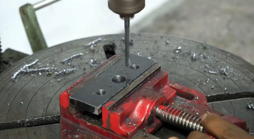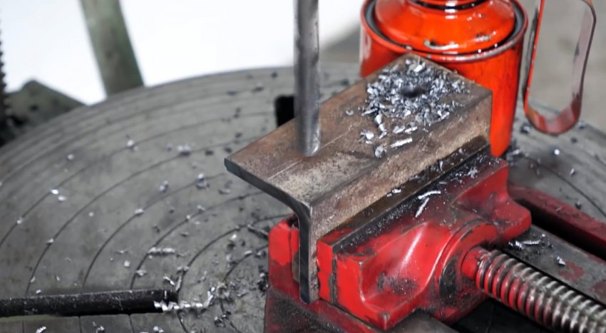 В третьем уголке такого же размера сверлим по два отверстия в полках: на одной – поперек по центру, на другой – продольно по краям и нарезаем резьбу.