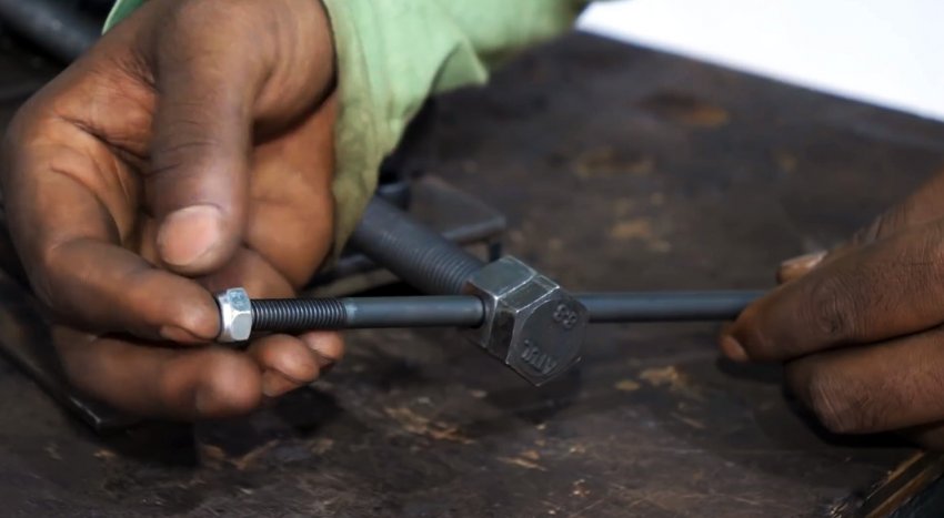 В отверстие гайки и ходового винта вставляем длинный болт и накручиваем на его конец самостопорящуюся гайку.