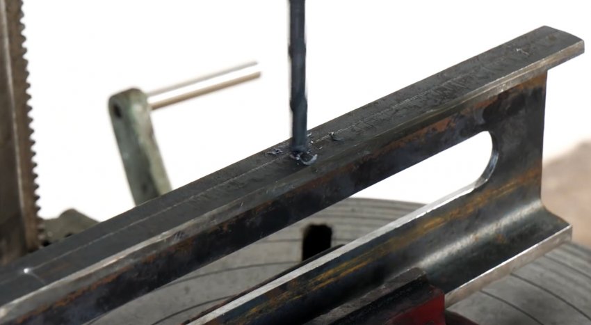 По центру стенки швеллера намечаем и сверлим два отверстия на равном удалении от краев профиля.