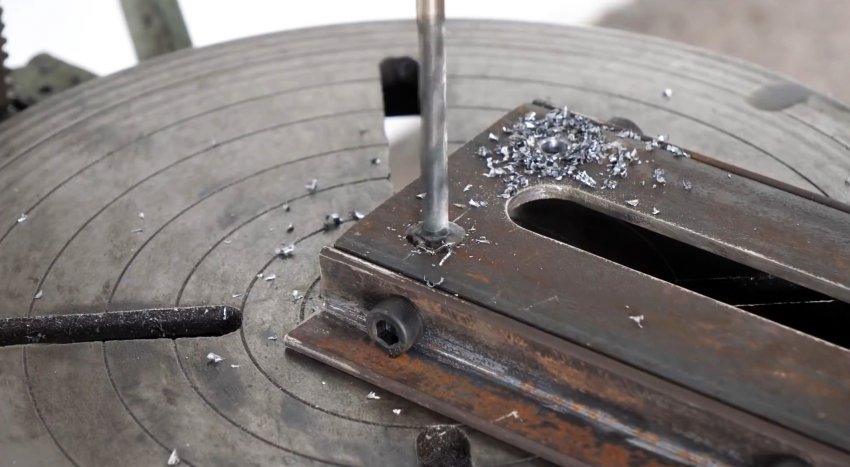 В узкой полоске металла сверлим три симметрично расположенных отверстия и к центральному отверстию выполняем поперечную прорезь для входа в проточку на ходовом винте.