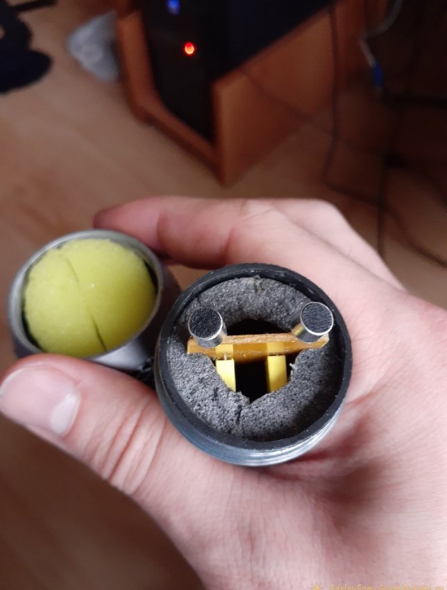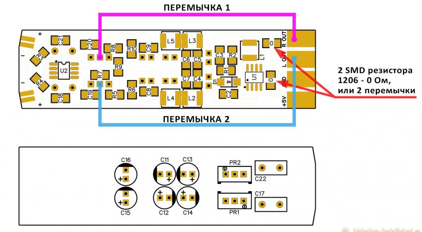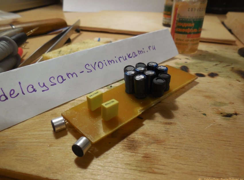 Электретные капсюли припаиваются прямо на плату с торца. С другой стороны платы находятся клеммы для подключения выходов (правый, левый) и питания 5 вольт. Минус питания и земля сигнала – один и тот же контакт. После пайки плату обязательно стоит отмыть от флюса (на фото процесс сборки).