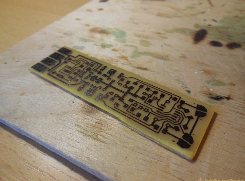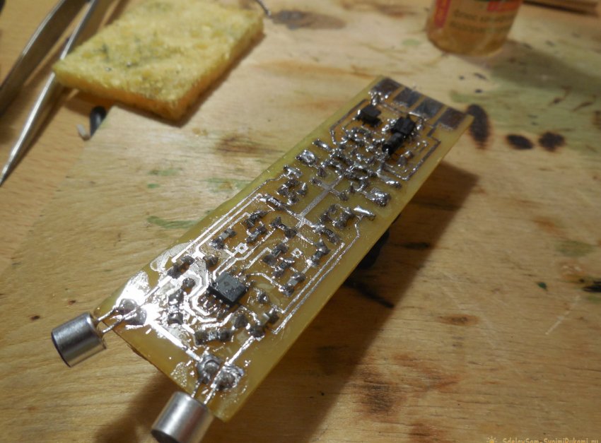Для того, чтобы электроника микрофона не занимала много места и легко поместилась в любой подходящий корпус, для сборки применяются SMD компоненты. Из выводных используются только электролитические конденсаторы в CLC фильтре и разделительные конденсаторы в усилителях, так как их предпочтительнее взять плёночные. Индуктивности в фильтре также можно использовать выводные, если под рукой нет SMD, как я и сделал. Сама печатная плата выполняется методом ЛУТ, найти рисунок дорожек для печати и схему расположения элементов можно будет в архиве.