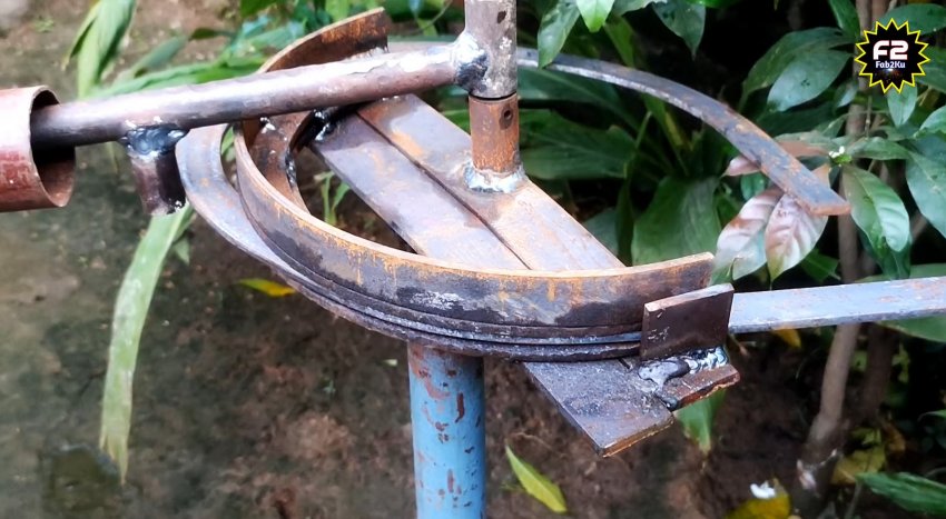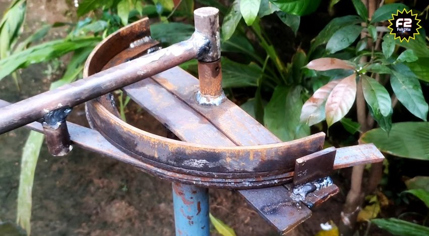 Конструкцию из дуг устанавливаем наружной пластиной на стойку и завариваем. Двухступенчатый цилиндр большей стороной привариваем снизу к краю рычага. На длине, равной от оси вращения рычага до внешней стороны дуг, привариваем стержень также снизу для воздействия на заготовку при ее изгибе.