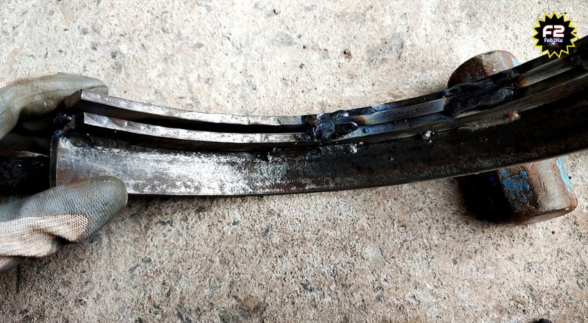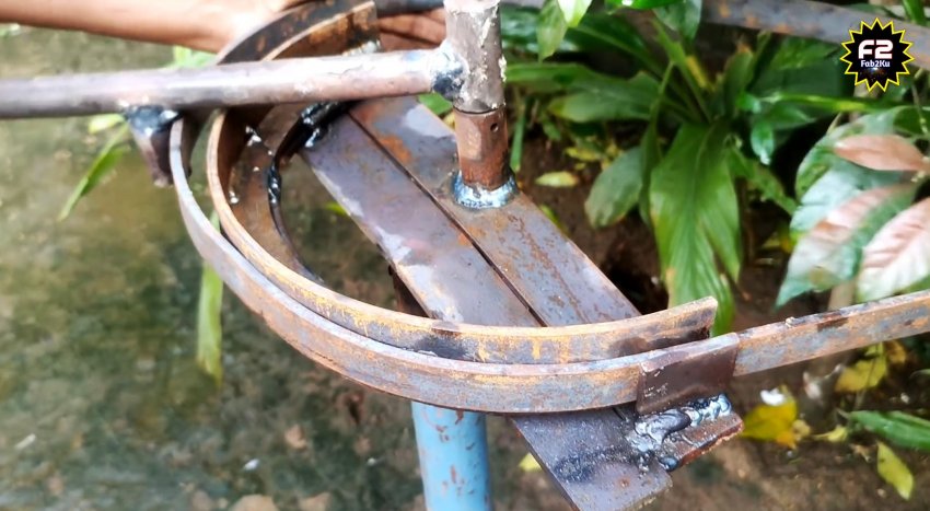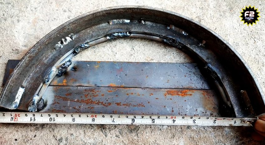 На этом же куске рельса, уложенном на бок, с двумя стальными жесткими и прочными «ушками», приваренными с зазором к внутренней стороне подошвы рельса, выгибаем на ребро вторую стальную полосу.