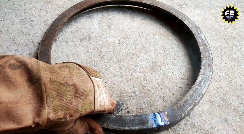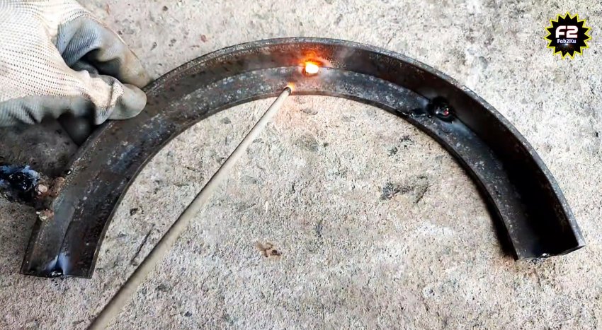 Полосу, изогнутую на ребро, укладываем на изогнутую плашмя так, чтобы их внешние стороны совпали, как и края. В таком положении изнутри привариваем их друг к другу.