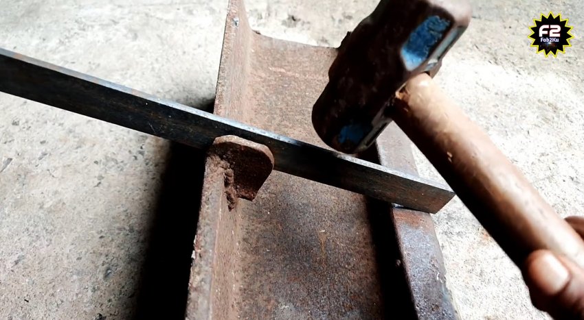 Для этого помещаем полосу между «ушками» так, чтобы ее край опирался на боковину головки рельса. Потом ударяем молотком по участку верхнего ребра между «ушками» и головкой рельса, постоянно изменяя положение полосы.