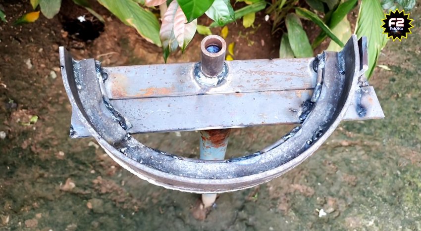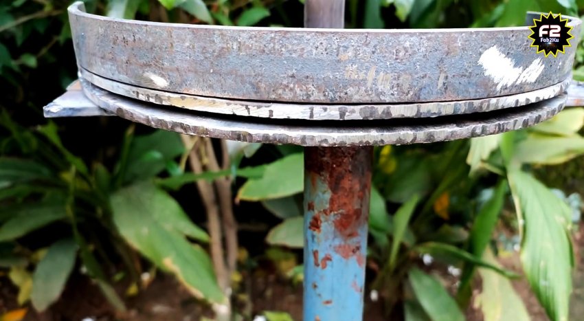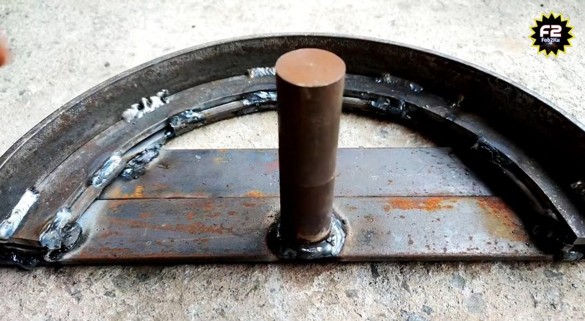 Переворачиваем конструкцию так, чтобы полосы оказались внизу. Отмечаем на нижней центр и привариваем там круглую втулку, в которую сверху вставляем двухступенчатый цилиндр, входящий в отверстие втулки.
