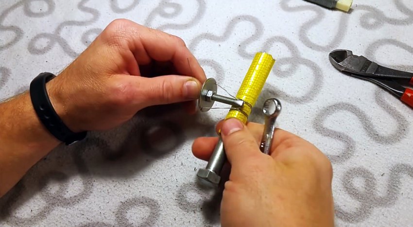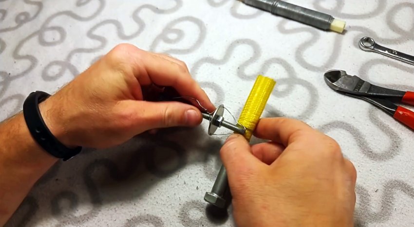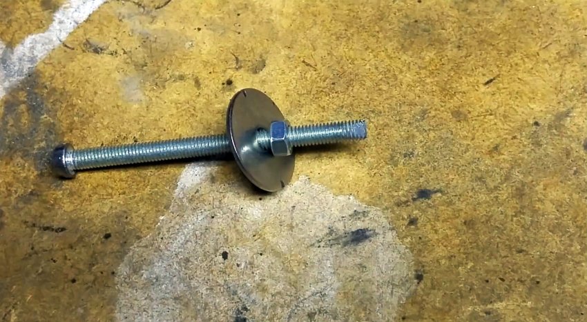 Надеваем на болт шайбу с двумя диаметрально противоположными прорезями, навинчиваем поверх нее гайку и наше приспособление готово к работе.