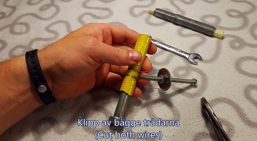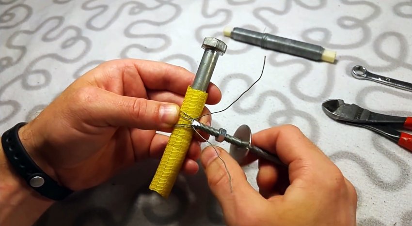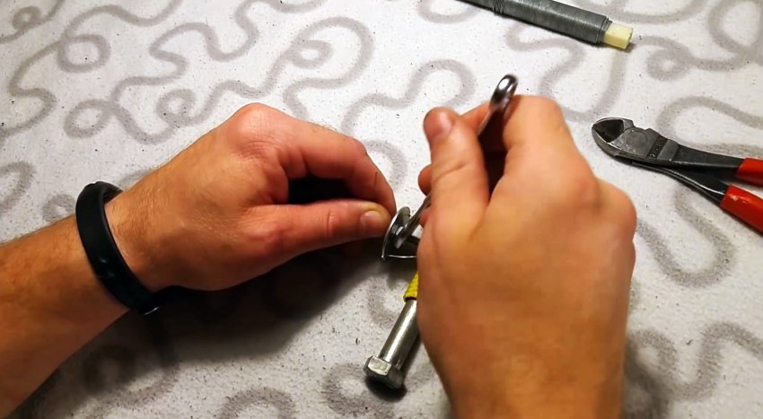 Прорезь на стержне болта приспособления упираем в петлю в направление натяга, а концы будущего проволочного хомута по одному заводим в прорези на шайбе, и обхватив стержень болта, надежно скручиваем их над шайбой.
