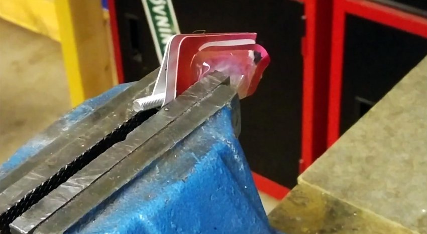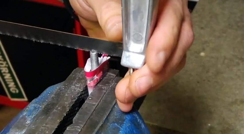 Чтобы болт не потерял товарного вида, через картонную бумагу зажимаем его в слесарные тиски и на торце резьбового стержня с помощью ножовки по металлу выполняем поперечную прорезь без заусенцев и острых граней.