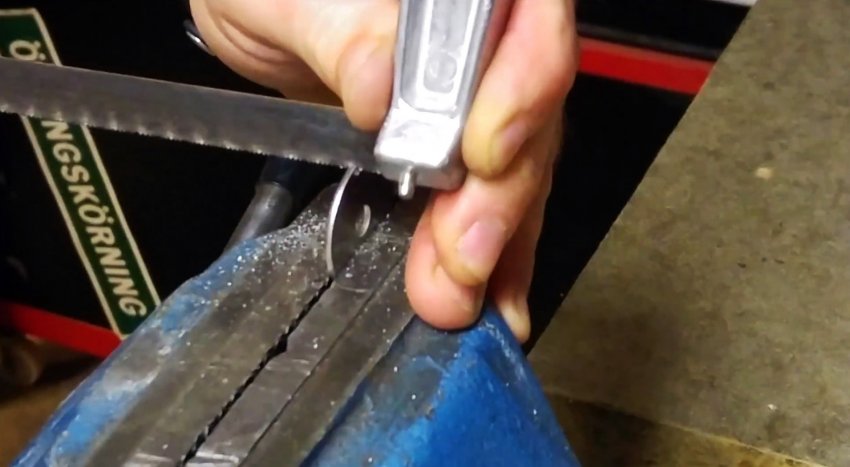 Затем зажимаем в тиски плоскую шайбу и той же ножовкой по металлу выполняем две прорези на диаметрально противоположных сторонах шайбы также без заусенцев и острых граней.