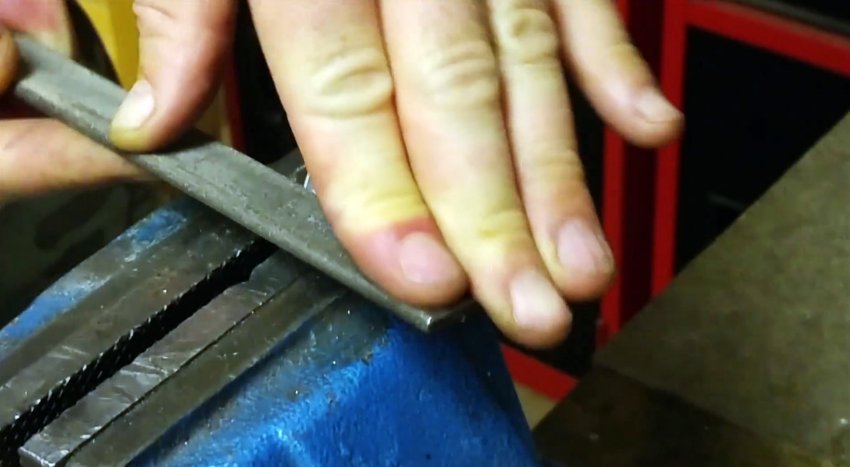 Вновь под углом зажимаем болт так, чтобы поперечная прорезь на конце резьбового стержня была расположена горизонтально и с двух сторон с помощью плоского напильника выполняем конусные лыски в направлении прорези.