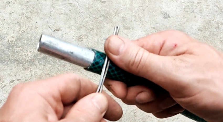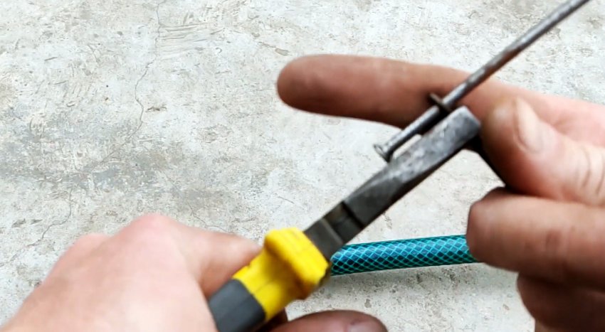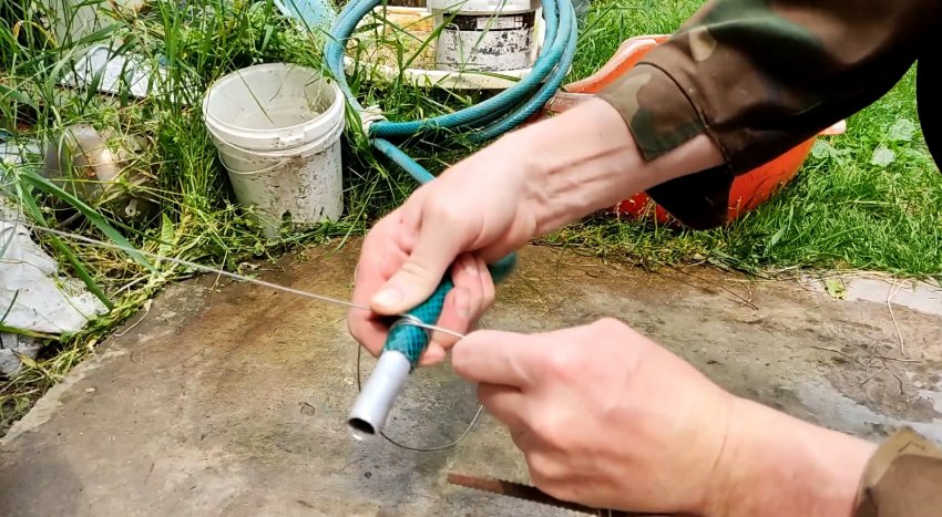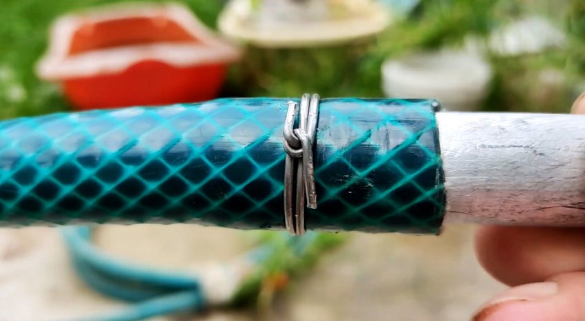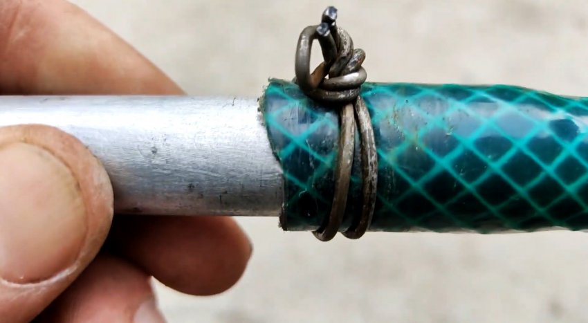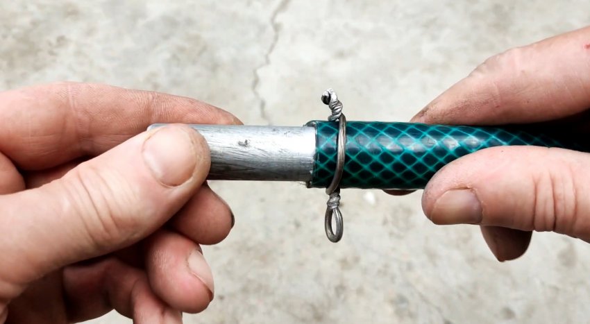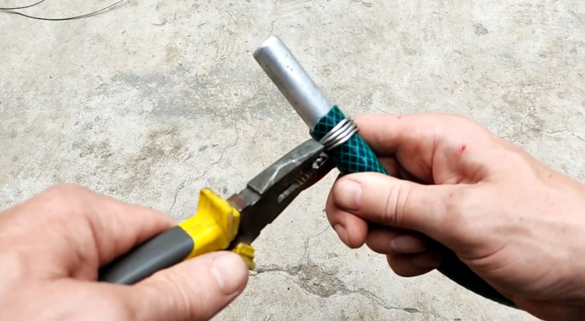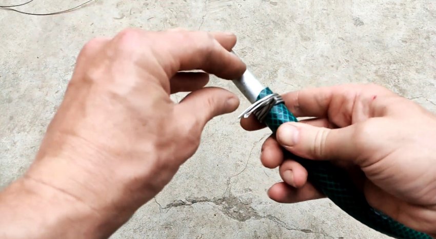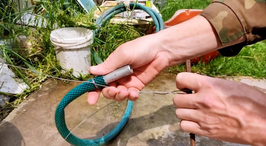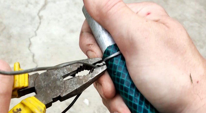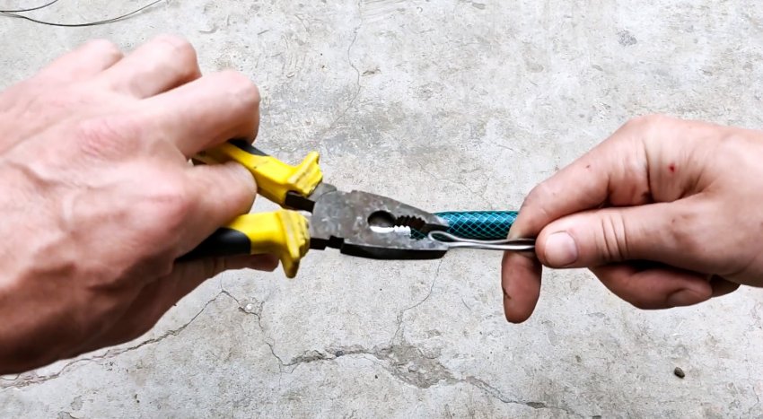 Используя шланг, прокручивая его, соединяем концы проволоки и затягиваем их без помощи пассатижей.