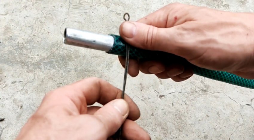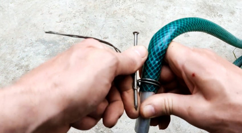 Потом накручивается проволока на шланг в один оборот, в петлю просовывается гвоздь.