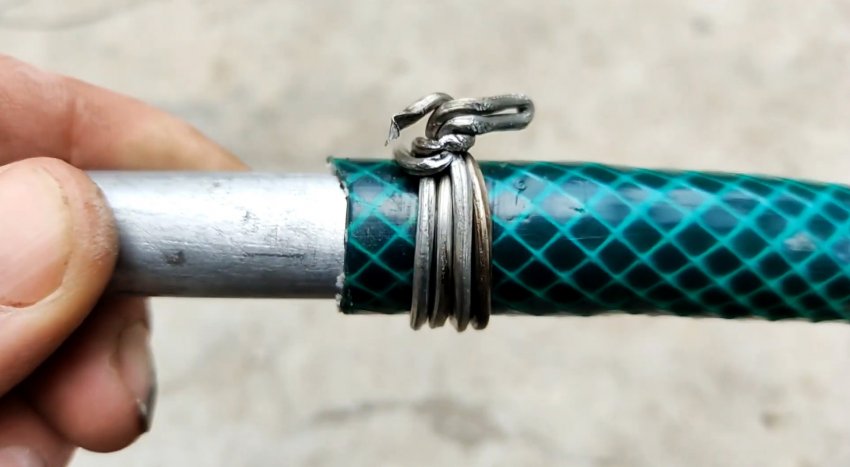 Подготовленный кусок проволоки нужно сложить пополам, а потом накрутить в два оборота на шланг, максимально натягивая.