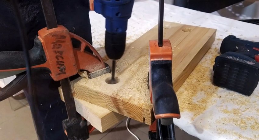 Затем поменяйте сверло на то которое нужно и просверлите деревяшку примерно на половину.