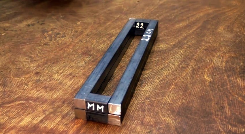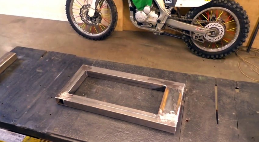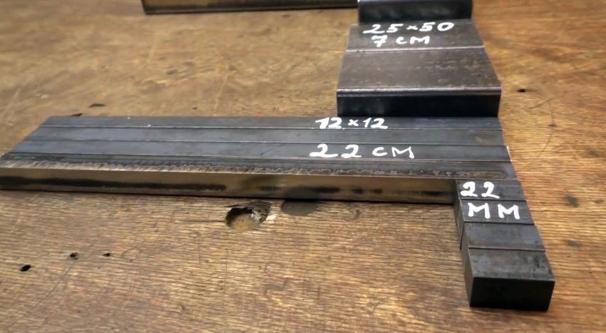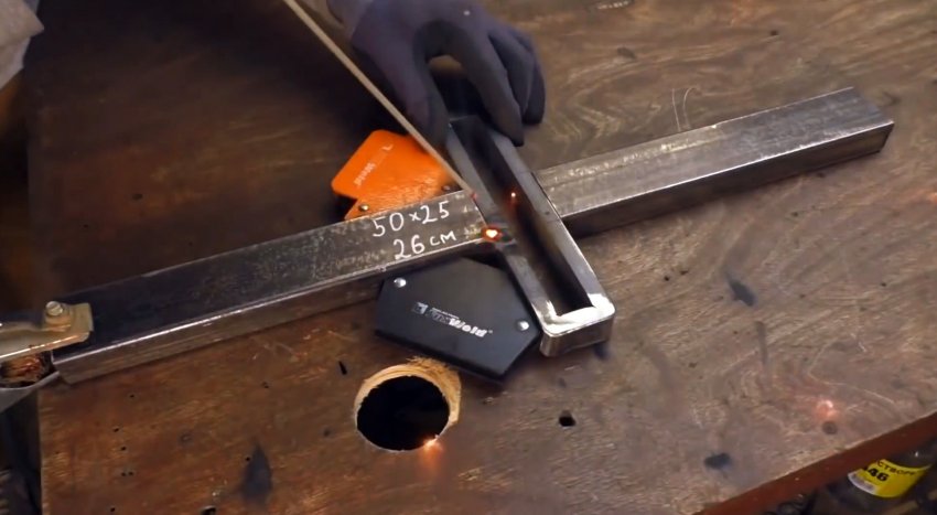 Из квадрата 12х12 мм вырезаются две заготовки длиной по 22 см и две по 2,2 см. Из них сваривается рамка. К ней привариваются трубы 50х25 мм длиной по 26 см.