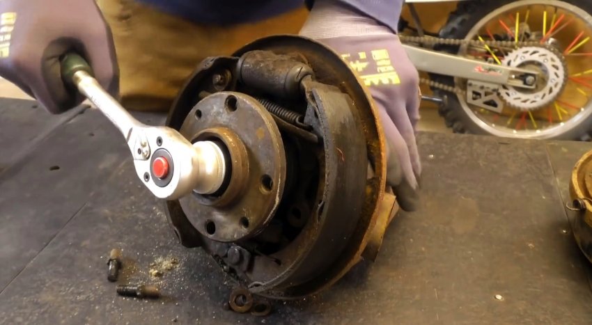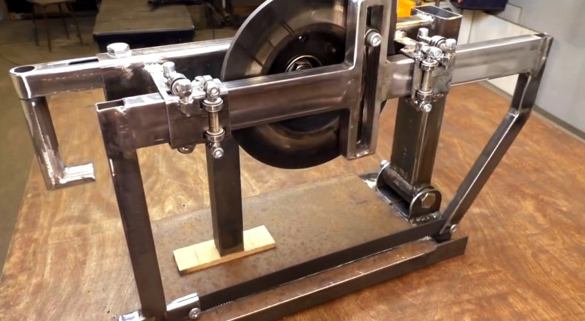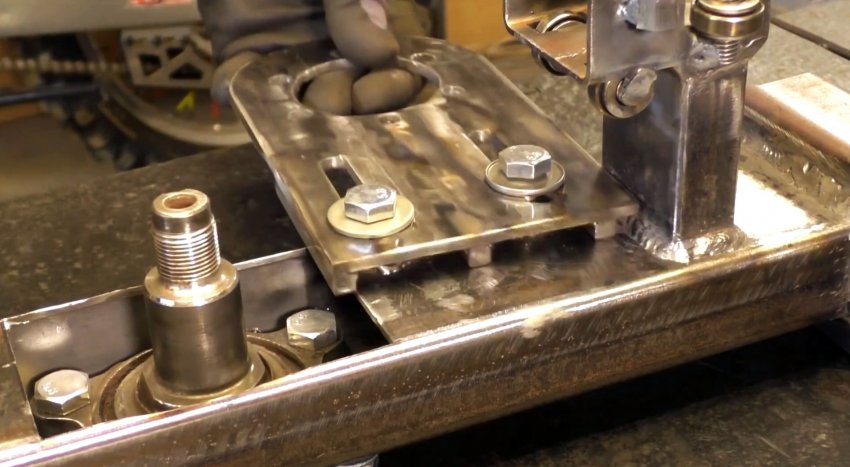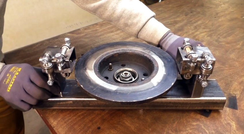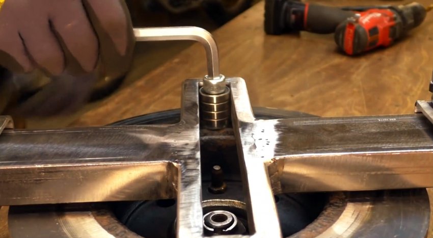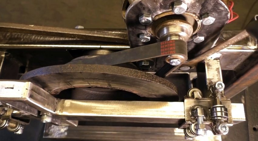 После этого нужно вкрутить в тормозной диск болт с подшипниками так, чтобы он цеплял при вращении деталь с рамкой. В итоге механизм будет превращать вращение ступицы от двигателя в поступательное движение штанги.