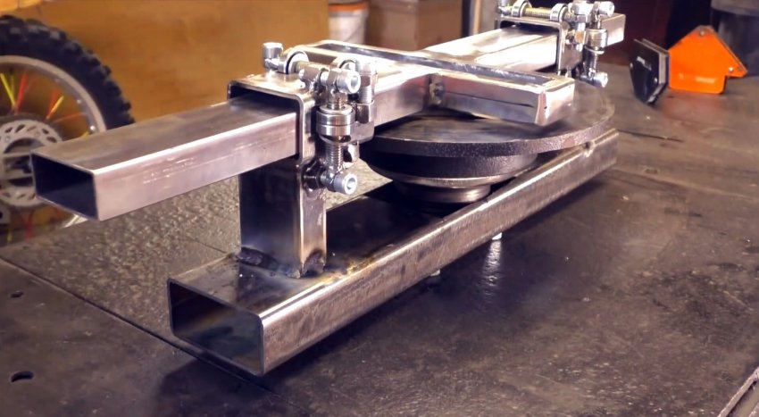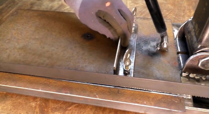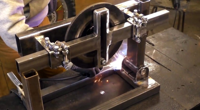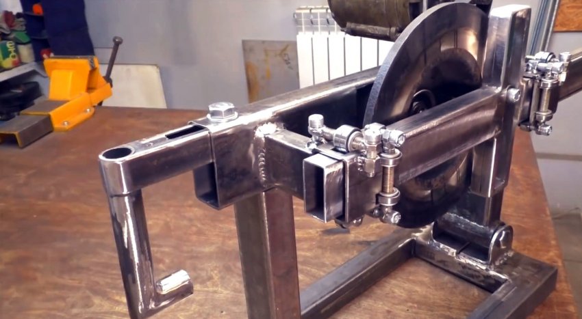 Далее из обычной круглой и профильной трубы необходимо сварить ручку для пилы. Она помещается в трубу крепления ступицы. На ней делается паз для регулировки. На станину приваривается листовая сталь для получения рабочего столика.