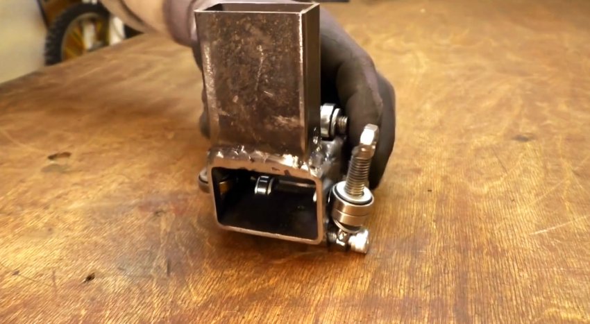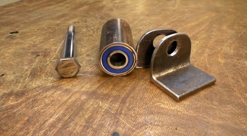 Далее необходимо заняться поворотным рычагом. Из двух уголков делаем проушины, на которые закрепляется барабан из труб с впрессованными подшипниками. Для их соединения потребуется сделать палец. К барабану приваривается отрезок трубы 80х40 мм.