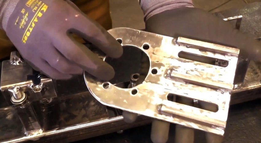 Далее каретки со стойками выставляются на основание со ступицей, и в них устанавливается последняя деталь с рамкой. Теперь регулируем, и привариваем заготовки.