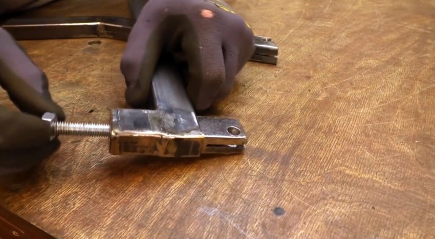 Полученная заковка приваривается краем с трубой под прямым углом к основанию механизма. Затем сваривается рамка, и приваривается к проушинам. Важно, чтобы она была параллельной относительно остальной станины. Напротив рычага привариваем стойку такой же длины.