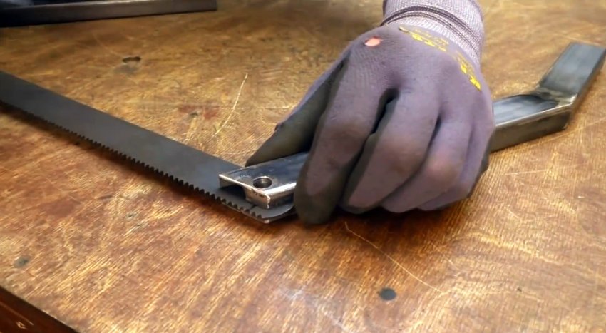 На подвижный шток приваривается рамка крепления пильного полотна с хвостовиком и натяжным винтом. Здесь просто повторяем конструкцию обычной ножовки по металлу.