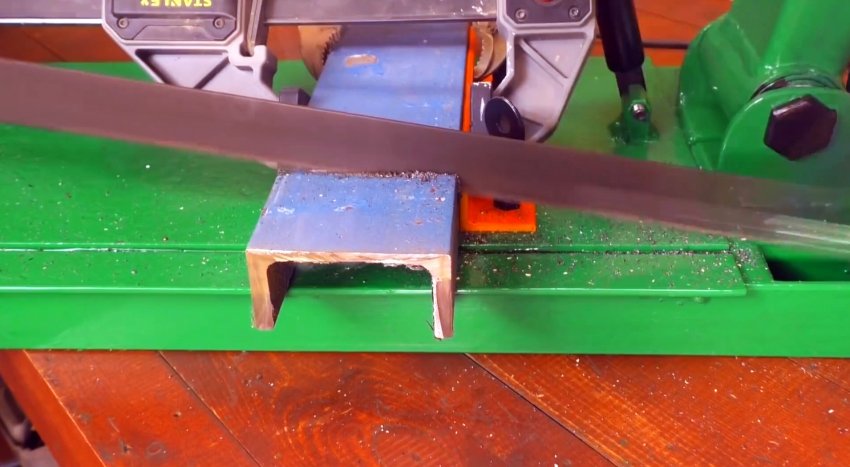 Обратите внимание, что трубу в углу подошвы нужно будет подрезать, чтобы она не мешала ходу полотна при подъеме. Сама пила должна в нижнем положении даже немного врезаться в столик. В таком случае полотно сможет полностью распиливать заготовки.