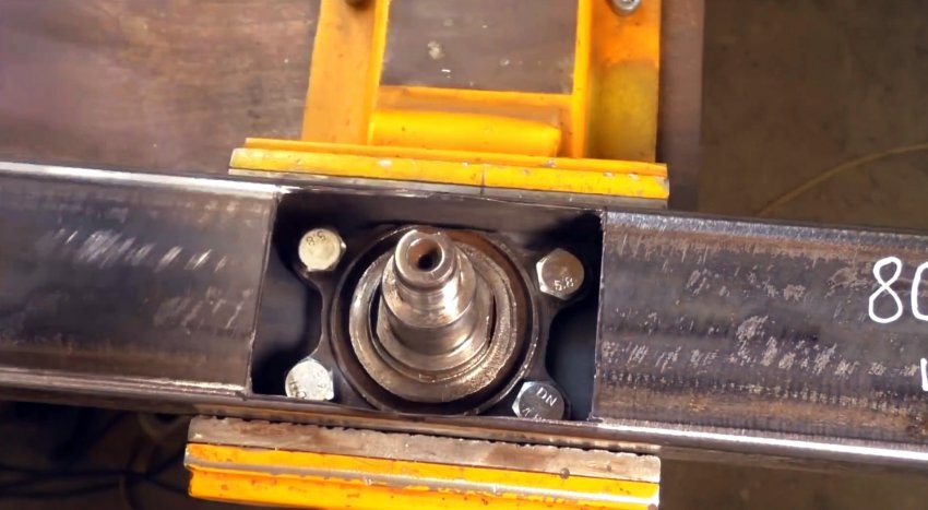 Далее прикрутить к ступице тормозной диск. Затем берем отрезок профильной трубы 80х40 мм длиной 47 см, и срезаем ее стенку в центре. Далее просверливаем деталь, и прикручиваем к ней ступицу болтами.