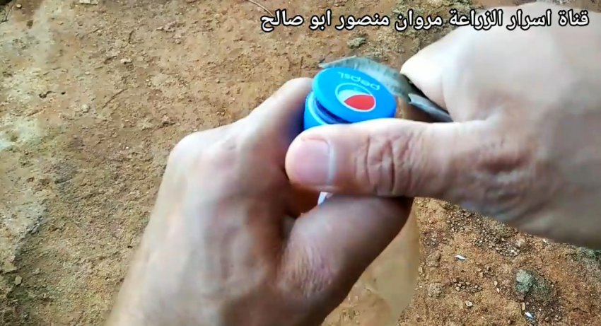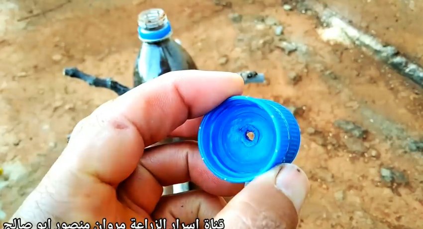 Для полива саженцев нужно будет клеить две целые крышки от бутылок, и проделать в них небольшое отверстие.