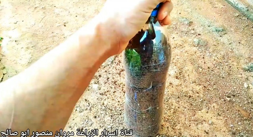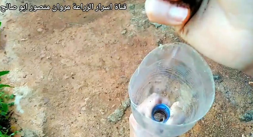 Теперь остатки крышки немного выкручиваются, чтобы приставить сверху горлышко от другой бутылки. В итоге получаем удобную воронку, чтобы засыпать грунт.