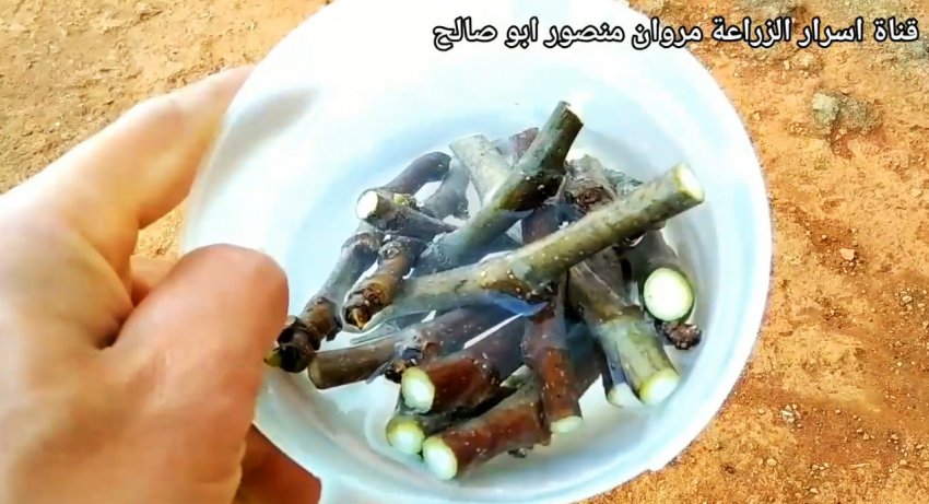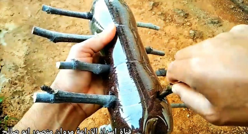 Далее в прорези высаживаются предварительно подрезанные и вымоченные в воде черенки.