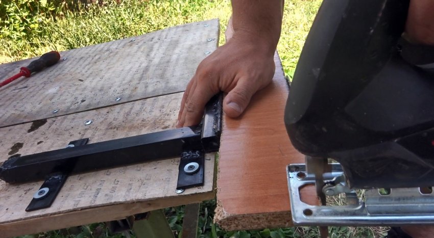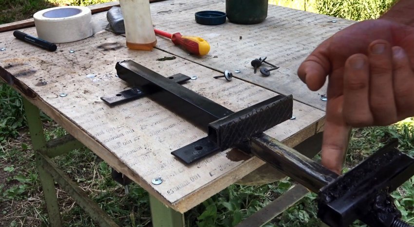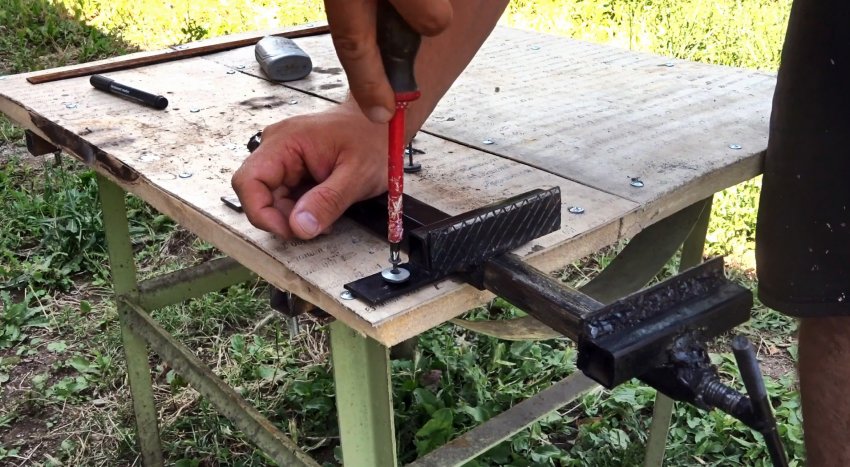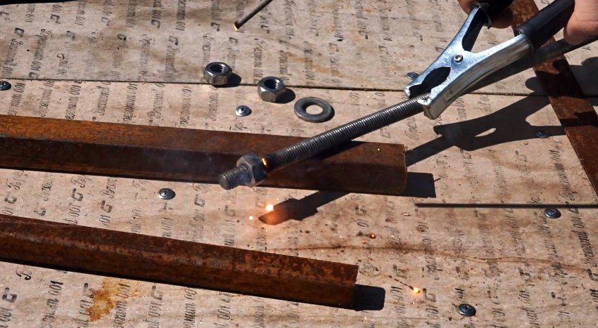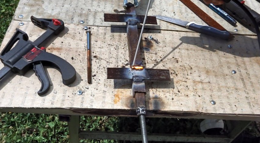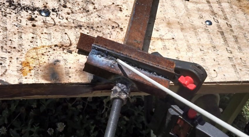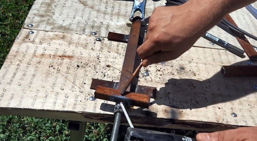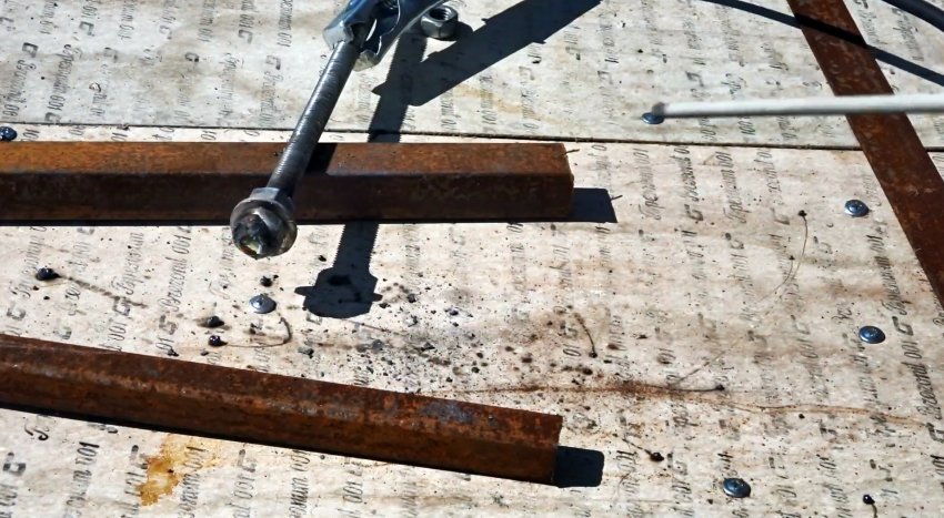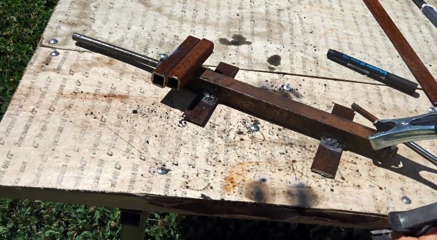 Складываем их насечками внутрь, выравниваем по торцам и высоте, устанавливаем между поперечно расположенными отрезками квадратных труб, чтобы они немного возвышались над ними, сжимаем с помощью ходового винта и привариваем каждую к прилегающему элементу.