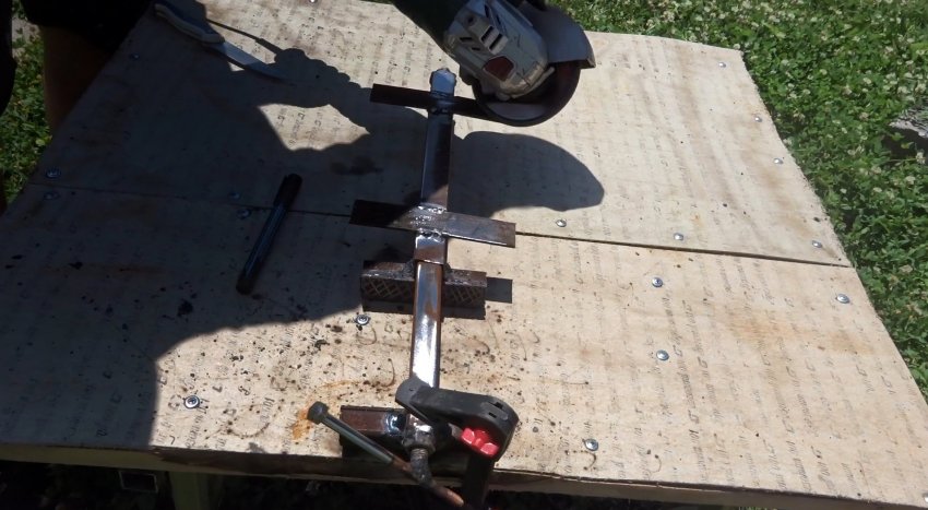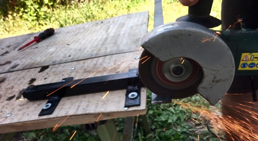 Отмечаем на стальной полосе два одинаковых фрагмента, которые по длине совпадают с поперечно приваренными элементами. На отмеченных участках стальной полосы болгаркой наносим крестообразную насечку и после разрезаем на две половины.