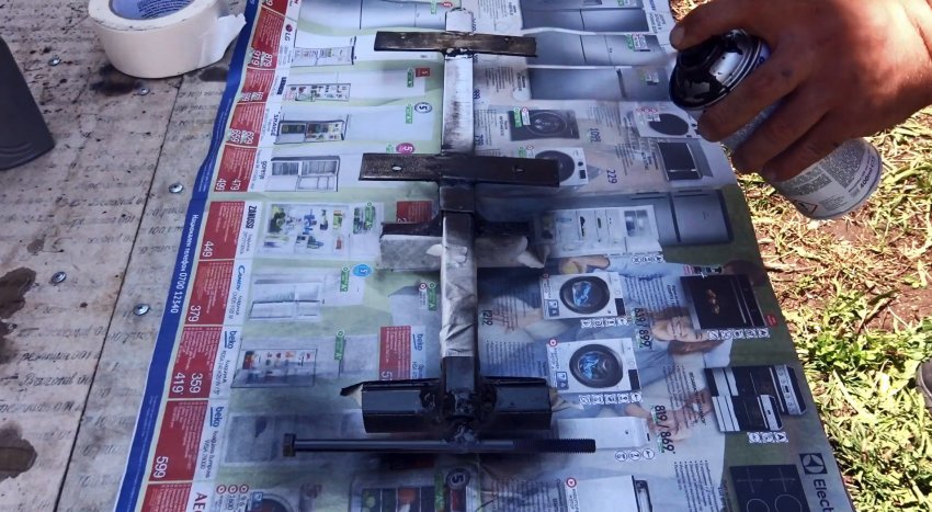Насечку губок и внутреннюю квадратную трубу прикрываем строительным скотчем и окрашиваем тиски аэрозольной краской.