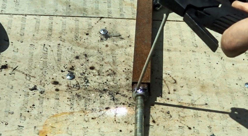 Вкручиваем ходовой винт до конца и на внешнюю квадратную трубу укладываем второй отрезок, плотно прижимая его к раннее приваренному, и выравнивая в поперечном направлении, также привариваем его со всех сторон.