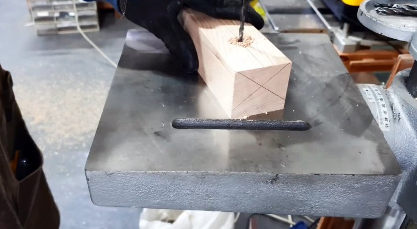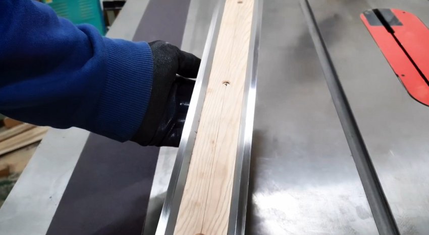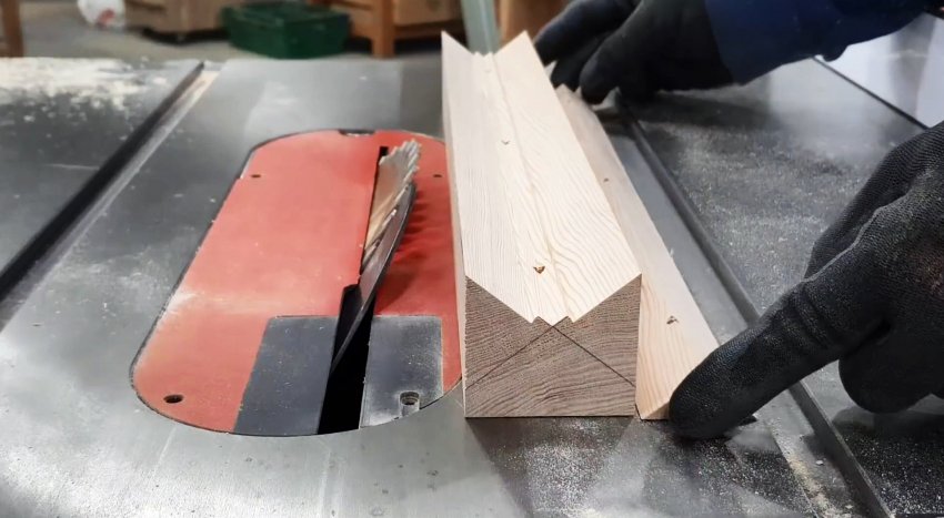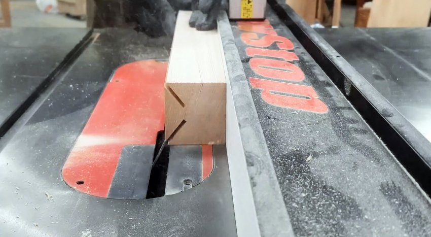 Сдвигаем боковой упор в сторону на толщину диска и снова делаем два перекрестных встречных пропила с получением треугольной планки и упоров для ножей. В треугольной планке расширяем три отверстия и вставляем в них шурупы.